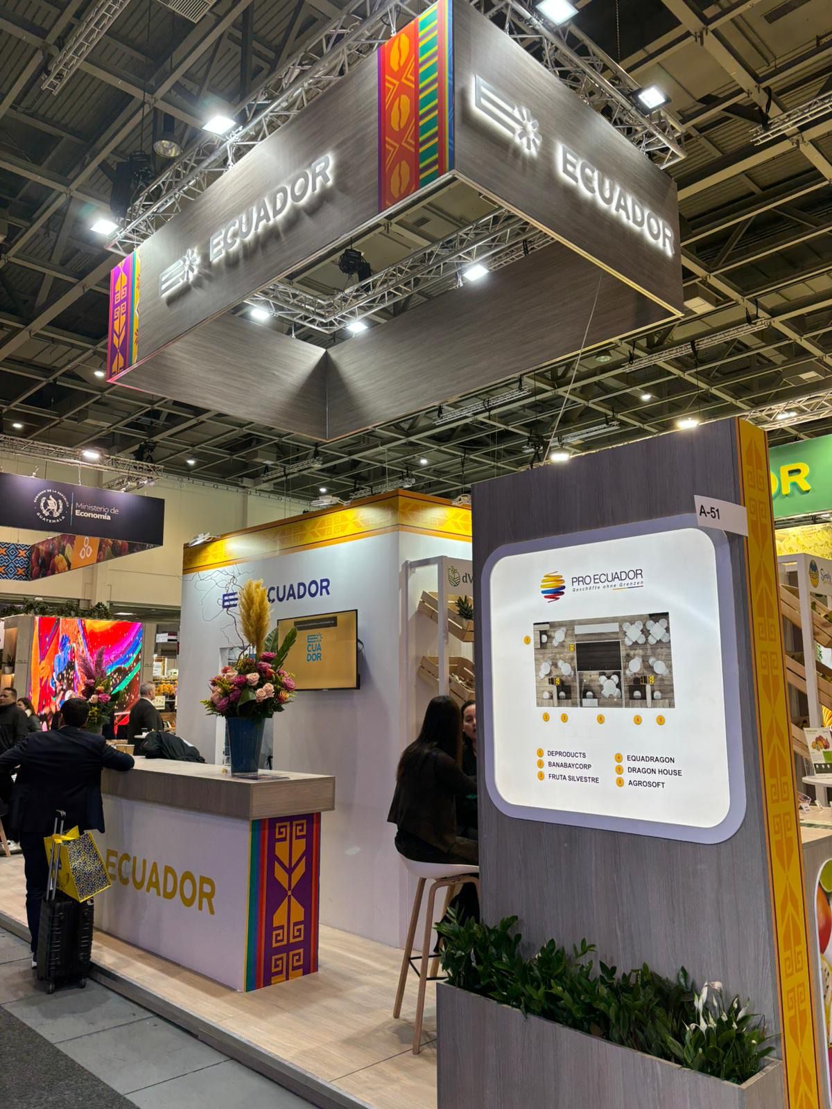 Durante la inauguración del pabellón de Ecuador se contó con la presencia del Embajador del Ecuador en Alemania, Vicente Albornoz; el Consejero Comercial de la Oficina Comercial de PRO ECUADOR en Alemania, César Rohon; el Presidente del Directorio de AEBE, Jorge Encalada; y el Director Ejecutivo de AEBE y Coordinador del Clúster Bananero del Ecuador, José Antonio Hidalgo. En este espacio, las empresas ecuatorianas promocionan productos como pitahaya, banano, piña, granadilla y mango, además de plataformas tecnológicas orientadas al comercio exterior.